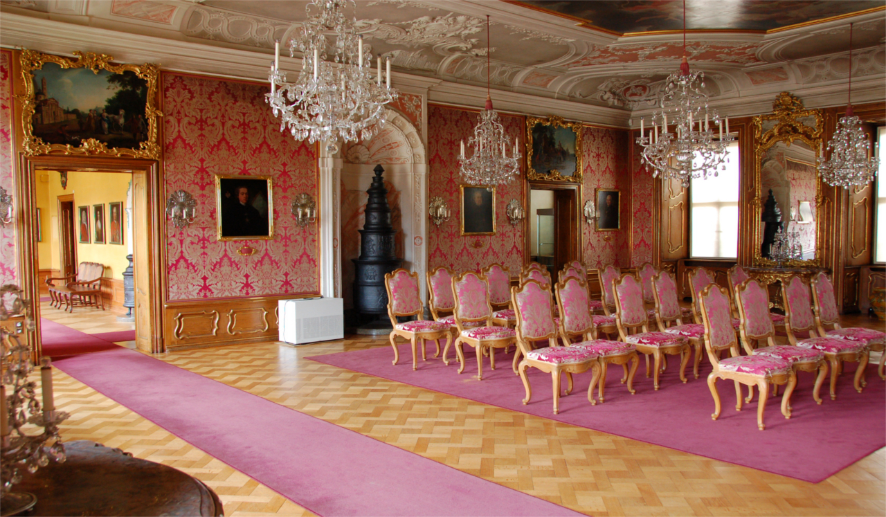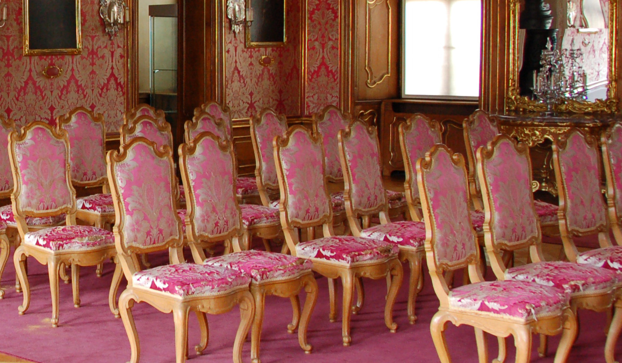 Die Rekonstruktion eines Raumes im Fuldaer Stadtschlosses wurde von uns umgesetzt und mit Seidenbrokat ausgestattet.