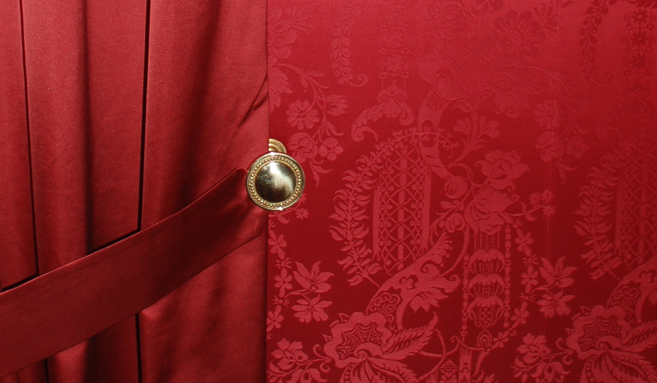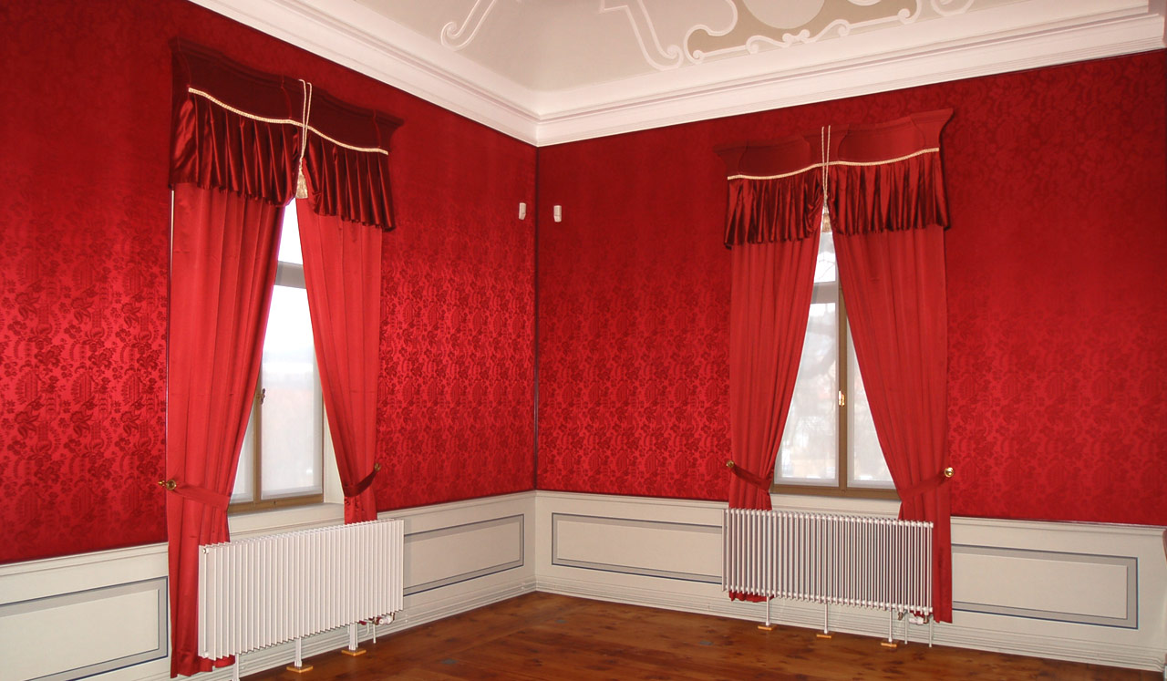 Hierbei handelt es sich um eine Rekonstruktion der Wandbespannungen im ersten Obergeschoss mit Seidenmoire und Zwirnhalbleinen.